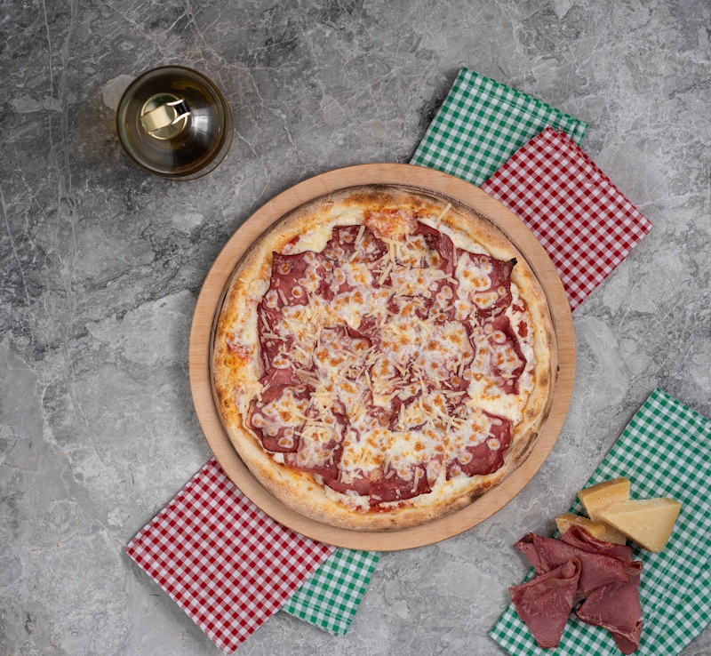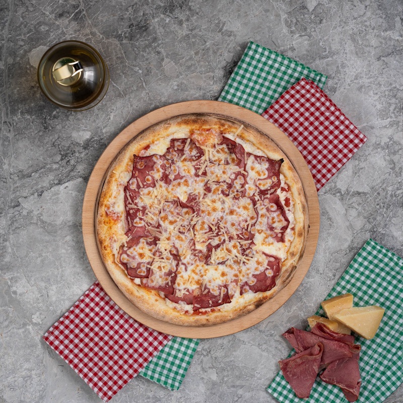 San Marzano Domates Sosu, Mozzarella Peyniri, Dana Füme Eti, Parmesan Peyniri