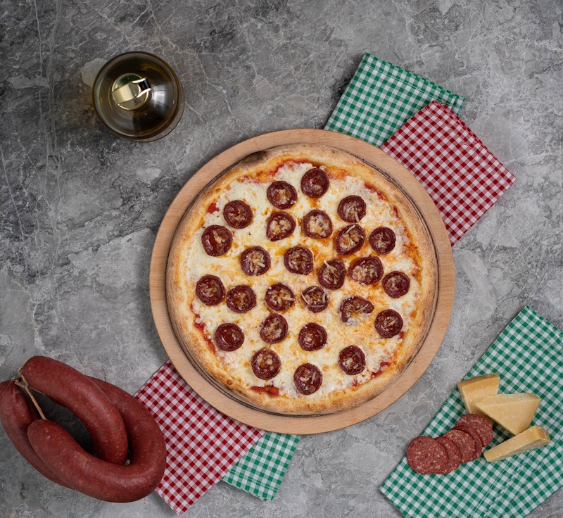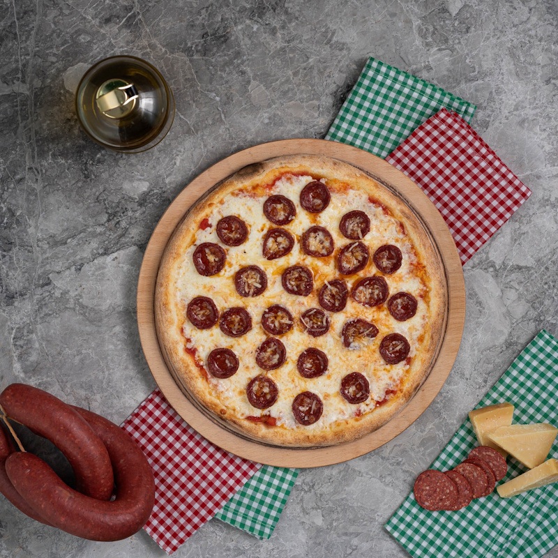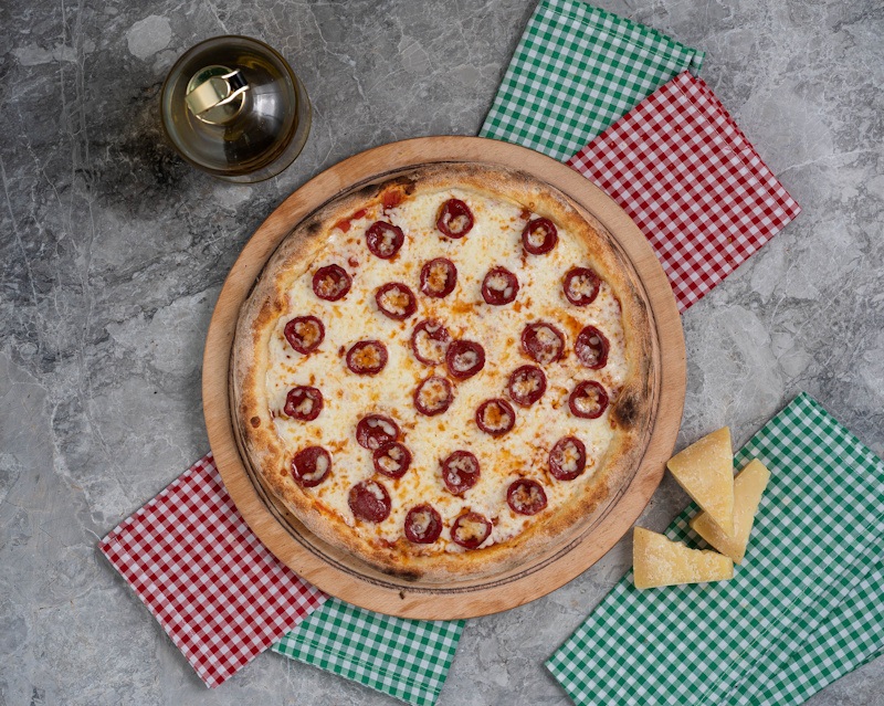 San Marzano Domates Sosu, Mozzarella Peyniri, Dana Sucuk, Mısır, Siyah Zeytin