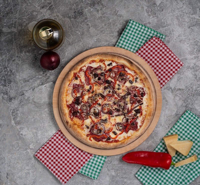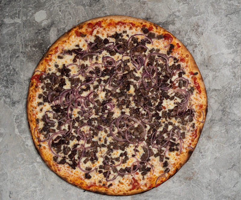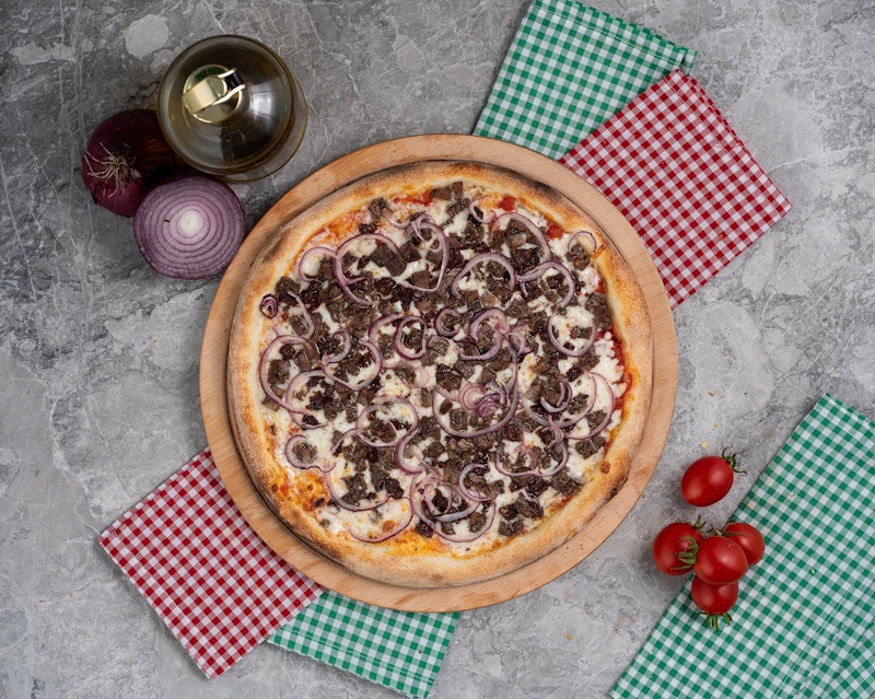 San marzano domates sosu, mozzarella peyniri, dana füme kaburga eti, köz soğan, kırmızı biber, özel nappoleia ...