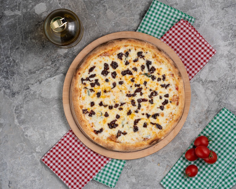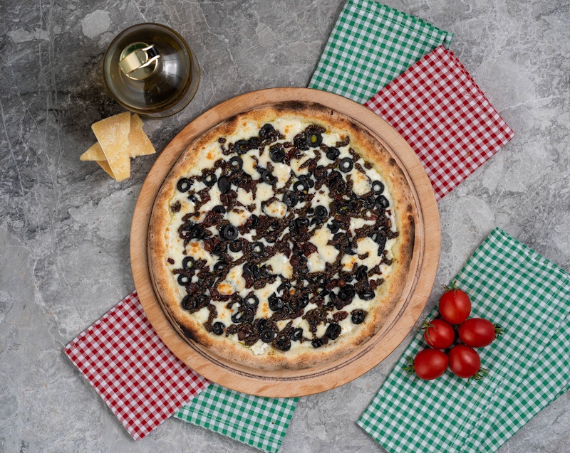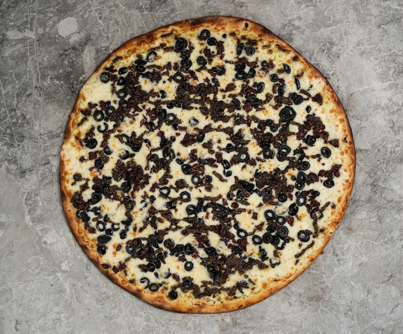 Beyaz sos, mozzarella peyniri, tulum peyniri, kurutulmuş domates, siyah zeytin, pesto sos