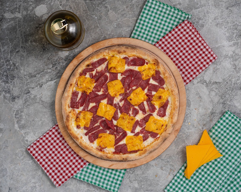 San Marzano Domates Sosu, Mozzarella Peyniri, Dana sosis, Cheddar peyniri
