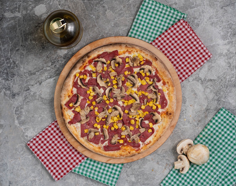 San marzano domates sosu, mozzarella peyniri, dana sosis, mısır, mantar