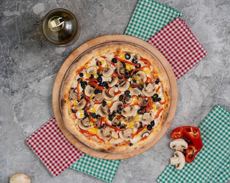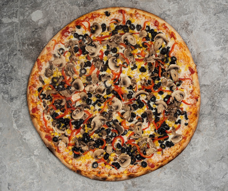 San Marzano Domates Sosu, Mozzarella Peyniri, Mantar, Kırmızı Biber, Mısır, Siyah Zeytin