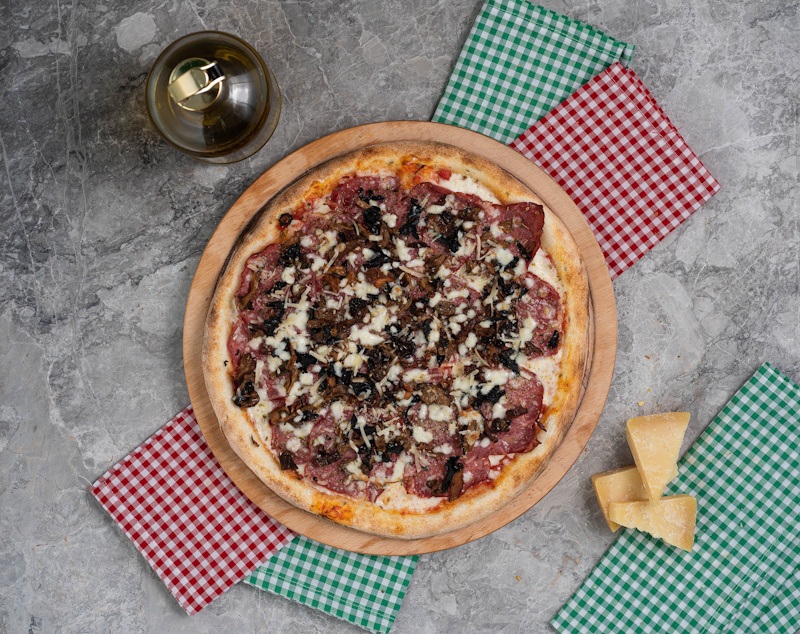San Marzano Domates Sosu, Mozzarella Peyniri, Dana Füme Kaburga Eti, Parmesan Peyniri, Kekik, Yabani Mantarlar...