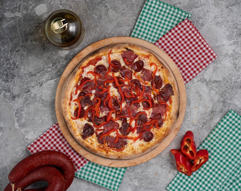 San marzano domates sosu, mozzarella peyniri, kırmızı biber, dana sucuk, pastırma