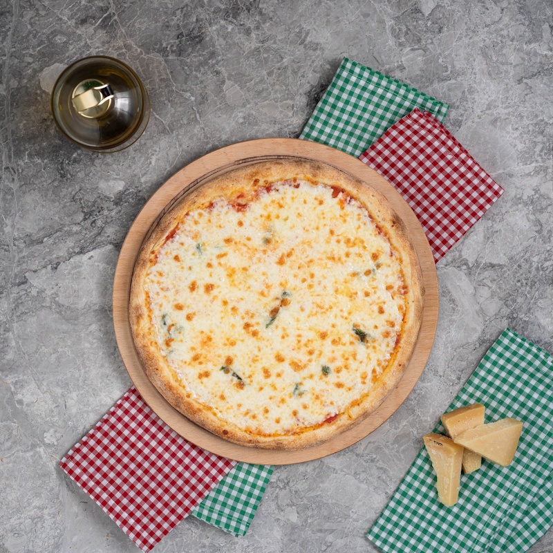 San marzano domates sosu, mozzarella peyniri, parmesan peyniri, taze fesleğen