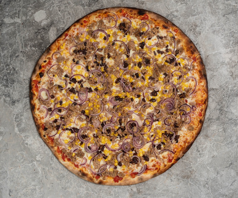 San marzano domates sosu, mozzarella peyniri, ton balığı, kurutulmuş domates, kırmızı soğan, mısır