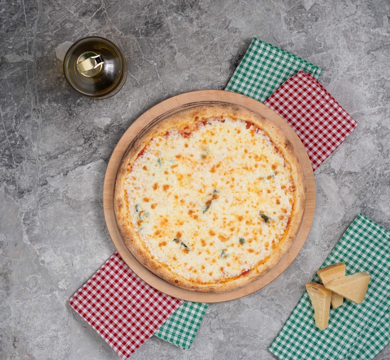 San marzano domates sosu, mozzarella peyniri, parmesan peyniri, taze fesleğen