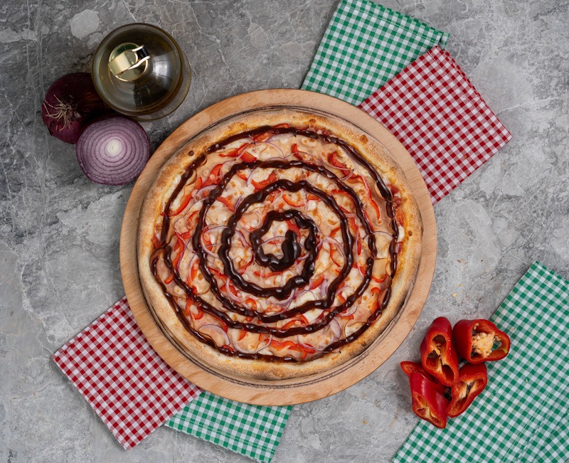 San Marzano Domates Sosu, Mozzarella Peyniri, Piliç Füme Eti , Kırmızı Biber, Kırmızı Soğan, Bbq Sos