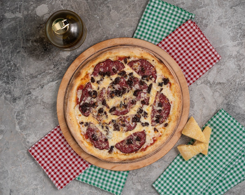 San Marzano Domates Sosu, Mozarella Peyniri, Dana Napoli Salam, Parmesan Peyniri, Kurutulmuş Domates, Sızma Ze...