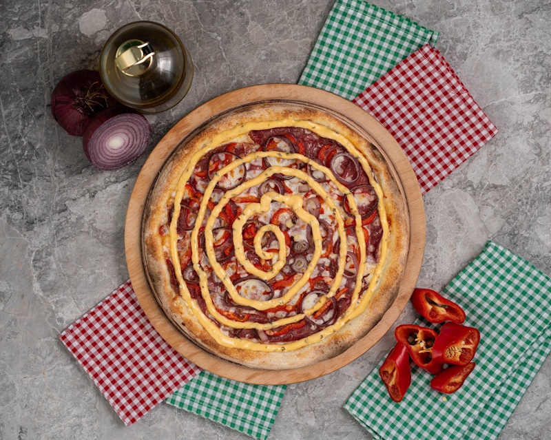 San marzano domates sosu, mozzarella peyniri, dana sucuk, mısır, siyahzeytin