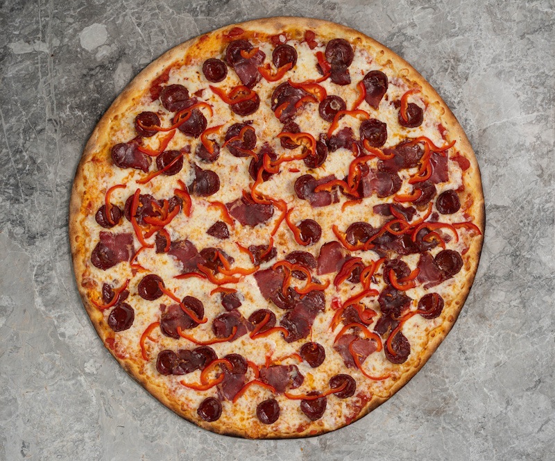 San marzano domates sosu, mozzarella peyniri, kırmızı biber, dana sucuk, pastırma