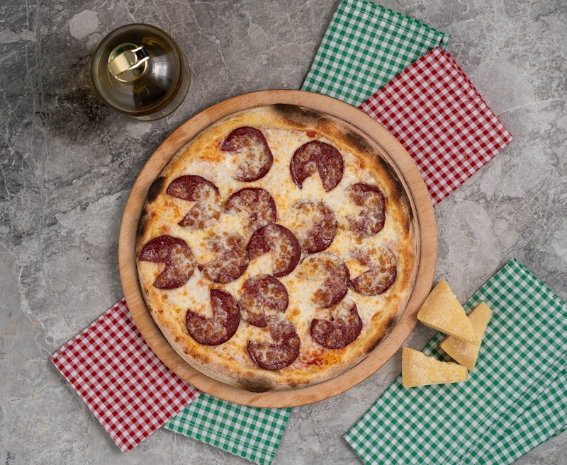 San Marzano Domates Sosu, Mozzarella Peyniri, Dana Sucuk, Mısır, Siyah Zeytin